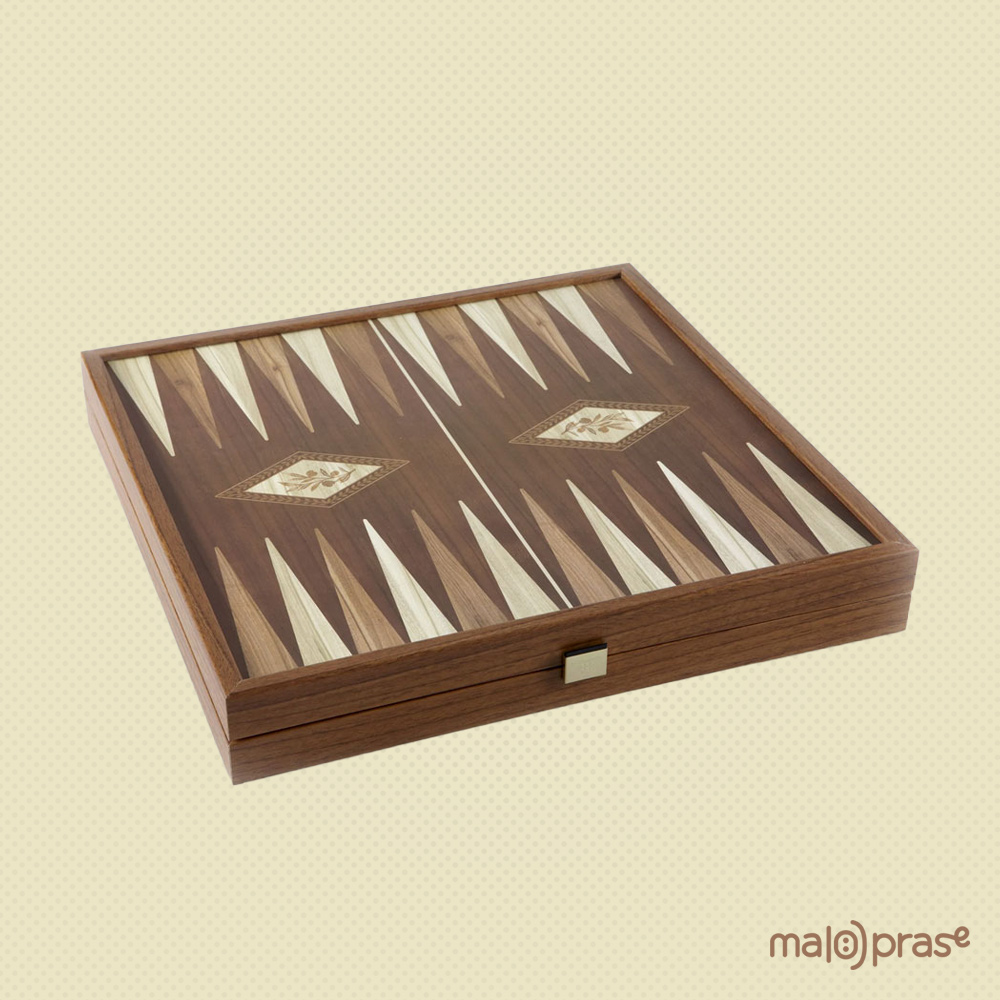 Kvalitetan ručno rađeni komplet za igru napravljen u porodičnoj firmi u Grčkoj. Figure za šah i bekgemon su smeštene u kutiju od medijapana koja sa spoljne strane ima tablu za šah, a sa druge strane tablu za bekgemon. Dobija se koplet za igru: pored kutije na kojoj se nalaze table za igru dobijaju se 32 šahovske figure, 30 žetona za bekgemon i pet kockica (po dve za igrače i jedna za dupliranje). Elegantan i stilizovan set je idealan kao ukras ili upravo za igru.